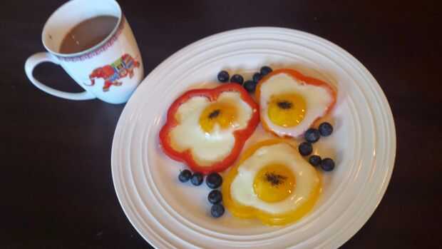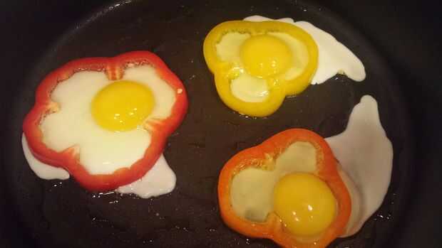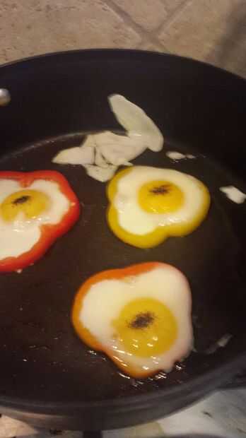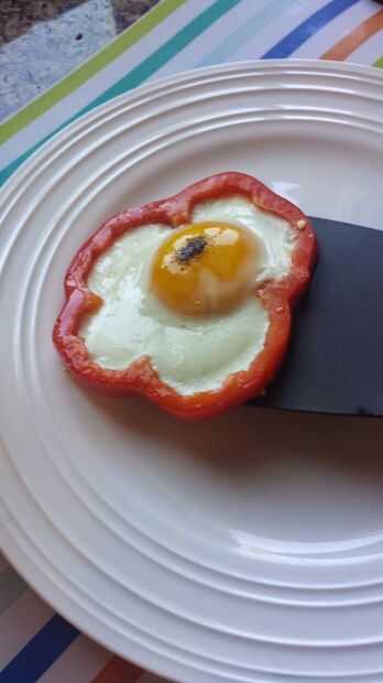 4. romper el huevo para que el yugo esté intacto y no rota, dentro del ring de la pimienta de bellper. Presione el anillo para que no salga la clara del huevo. Si lo hace su es perfectamente aceptable, no te preocupes. Vamos a eliminar la clara de huevo exceso más tarde. Espolvorear sal según sea necesario y frote un poco de pimienta en el centro del yugo de la