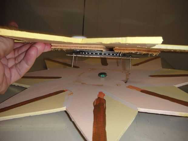 Esto es un poco de un rompecabezas, pero con paciencia puede deslizar los cuatro tornillos de máquina de la bandeja giratoria a través de 4 orificios en la pieza de madera de mediano.