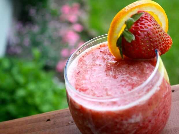 Esta receta es sencilla, después de preparar las fresas. Echar todo en una licuadora y mezcla durante unos 25 segundos en el hielo crush ajuste. Vierte en un vaso y decorar con una fresa y una rueda de naranja. VIOLA. Su refrescante boozed fruta smoothie espera.