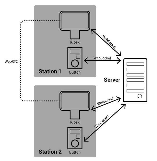 Cuando ambos botones son detectados como abajo activa la conexión de la web se realiza entre los dos quioscos y se inicia la alimentación de video. Si se suelta cualquier botón, el vídeo de alimentación rápidamente desaparece.