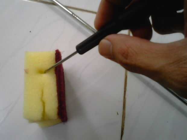 - Perforar la esponja de lavar plato con su mini destornillador, siguen el patrón de su memoria.