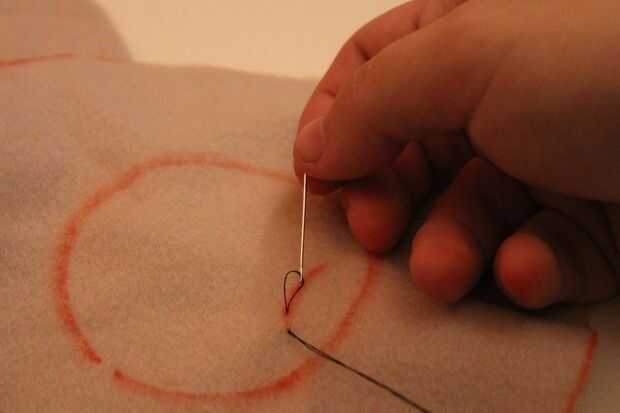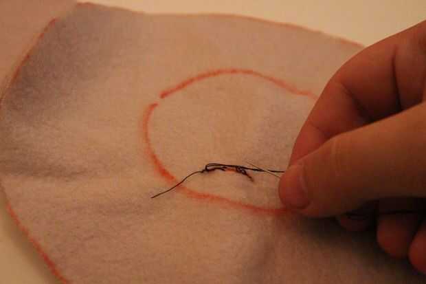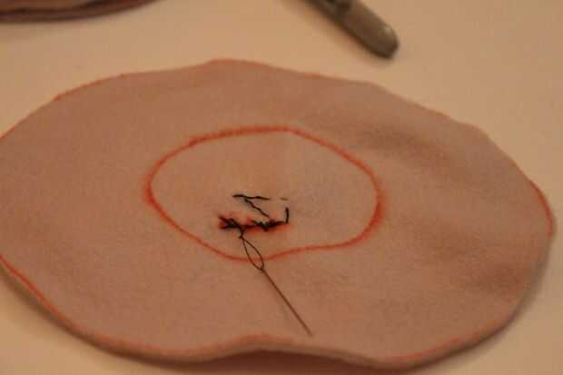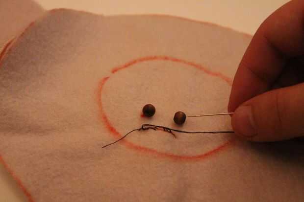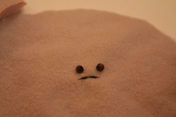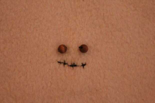 dibujar una carita en el círculo pequeño entre el centro del círculo y su borde y luego usar hilo negro de coser los rasgos. Utilicé una puntada bucle para un aspecto rústico pero se puede crear cualquier tipo de características que desea.