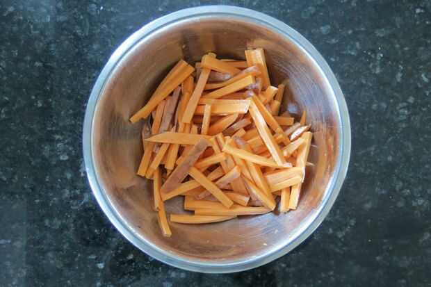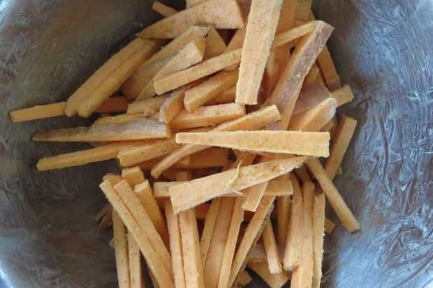 3. agregar el almidón de maíz y pimienta roja molida y mezcle las papas hasta que estén bien cubiertas.