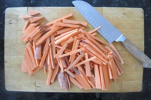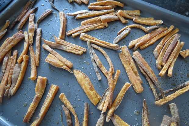 4. organizar fritas en un abundante bandeja de hornear engrasada, hacer que se encuentran en una sola capa y no lleno de gente para conseguir mejor nitidez. Hornear a 425F durante 15 minutos. Vuelta las papas y cueza al horno por otros 10 minutos o hasta dorar ligeramente y crujiente.