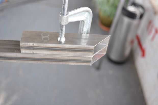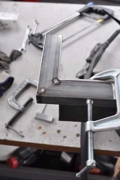 La plataforma está formada por dos montantes principales que se mantienen unidas por los estantes. Para asegurar que todo fue incluso, yo simplemente sujeta los juntos. Aquí, vemos el inglete de 45 º que define la parte superior. (No mostrado) se sueldan las placas de montaje (que sujeta a la pared) hasta el final de la pata corta.