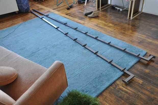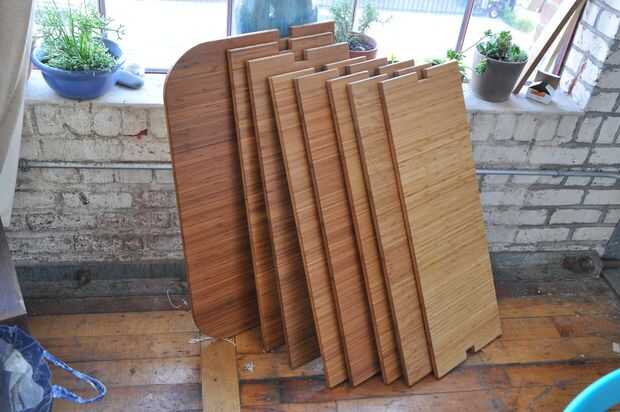 Con la soldadura en las piernas completa, fueron enviados para el recubrimiento de polvo, y los estantes se lija de grano 220 y acabados con varias capas de poliuretano.
