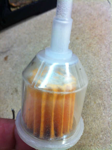 Buena noticia es que un filtro de gas barato (3-5 euros en cualquier tienda de auto parte) va a durar un par de semanas a un par de meses para un uso en bricolaje. Como se puede ver, los gases rápidamente hace un depósito blanco, que en un punto totalmente obstruirá el filtro (primer cuadro). El segundo filtro (segunda foto) se quedó limpio el mismo tiempo.