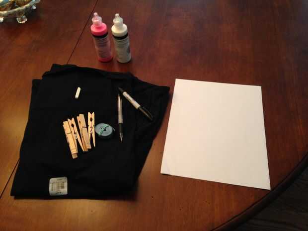Aquí están los suministros que usted necesitará: papel de impresora (w/computadora + impresora) camisetas de color negro oscuro pintura de tela cinta de medición alfileres de la ropa tiza marcador de pluma negro cartulina (no fotografiado) cinta y tijeras (no fotografiados)