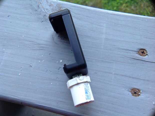 Ejecutar el perno a través del agujero en el tapón, luego coloque la otra tuerca en el perno para sujetar firmemente en su lugar. Tienes que tener alrededor de 1/4 de pulgada de rosca expuestos cuando termine para que usted puede montar a éste el adaptador de trípode de su teléfono celular.