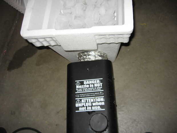 Conecte el refrigerador a su máquina de niebla empujando el extremo más largo de la manguera alrededor de la boquilla de la máquina de la niebla. mantener a los dos juntos y todos de la niebla irá en la manguera.