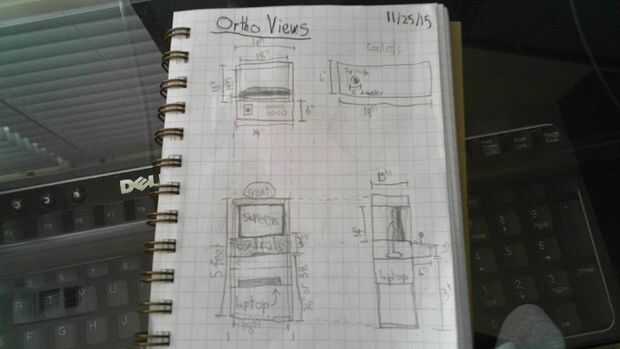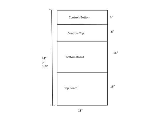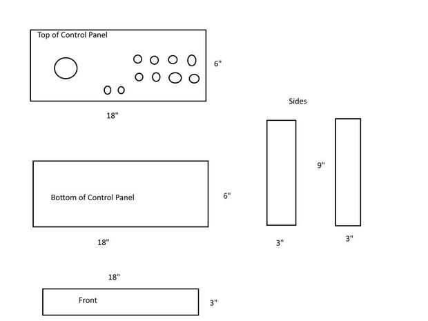 Una vez que hayas recogido tus herramientas y materiales, usted necesita medir la madera contrachapada. Sobre tengo medidas, así como (no) muy impresionantes dibujos de lo que debe parecer en mi cuaderno. Tenga en cuenta que cuando usted está midiendo frente necesitará recortar dos pedacitos en las esquinas para que el tablero de control puede caber. Ver el cuadro para la referencia. Para la espalda y los lados, mi papá y yo fuimos a Home Depot para conseguir más madera. Hay más sobre eso en el siguiente paso.