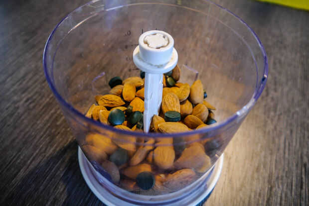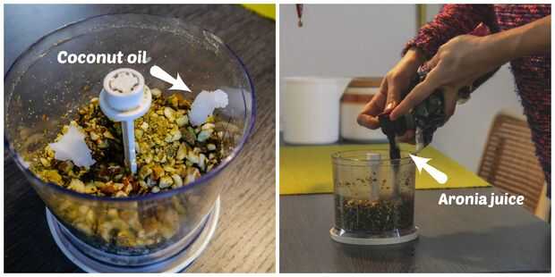 Mezcle las fechas. Mezclar almendras, espirulina y Chlorella. Añadir el polvo de té verde Matcha. Añadir aceite de coco y zumo de aronia, por lo que se vuelve pegajosa.