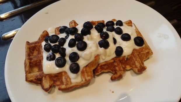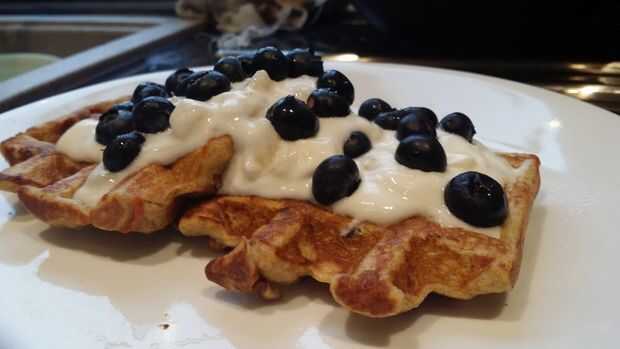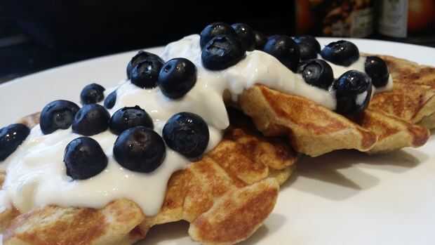 Decorar con arándanos y yogur griego con sabor, servir caliente.