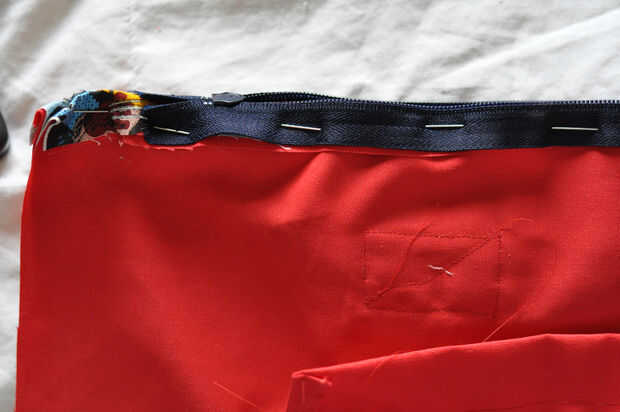 3. para terminar la bolsa, doblar el rectángulo junto con la guarnición hacia fuera y la cremallera en lugar del perno. Coser la cremallera en su lugar con un pie de cremallera. Coser juntos los extremos más allá de la cremallera.