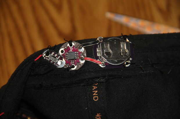 Como se muestra que la idea es hacer que la electrónica y batería detrás de la costura de la banda de la cabeza. El sostenedor de batería CR2032 se suelda por cables cortos para el LilyTiny y el interruptor ON/OFF se suelda directamente en el puerto 2 en la LilyTiny.