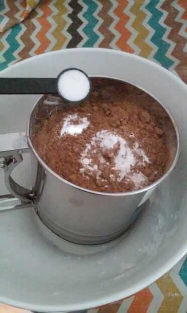 5. en un recipiente aparte tamizar juntos harina, cacao en polvo, bicarbonato de sodio y la sal.
