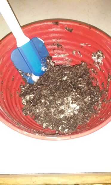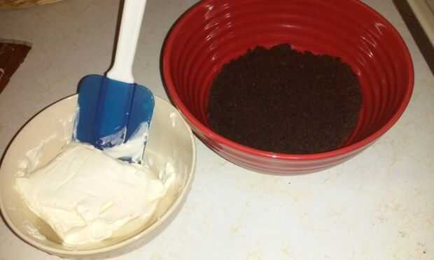 1. mezclar el queso crema ablandado y las migas de galletas Oreo machacadas. Puede utilizar una cuchara plana grande, o mezclar con las manos como lo hice :)