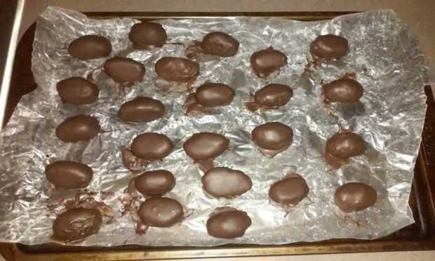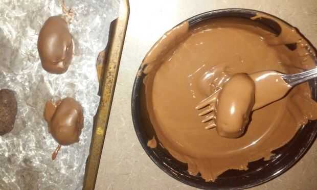 5. Retire los de congelador y sumérjalos en el chocolate con leche con un tenedor, quitar el exceso de leche chocolate, para mantener la forma de los balones de fútbol. Luego los ponen en el papel encerado.