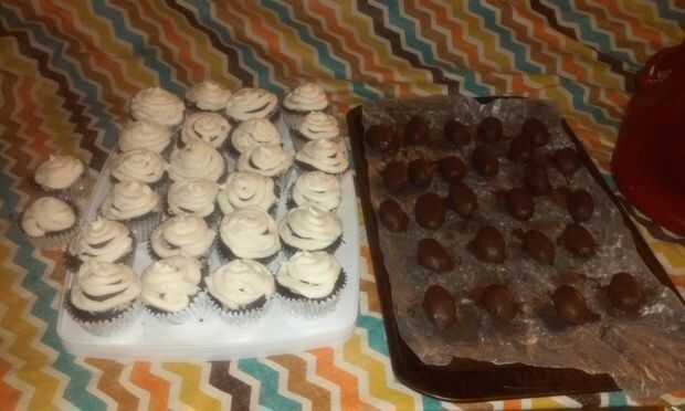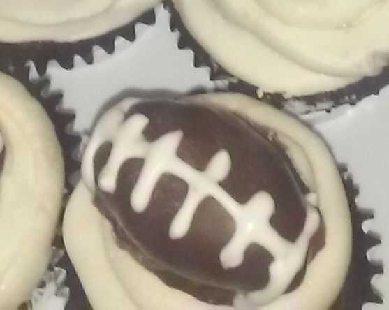 Ahora en la decoración... después de que el balompié se ha secado de ser bañadas en chocolate con leche, usted puede de la pipa en la guinda con una manga pastelera o bolsa de Ziploc con una esquina cortada. La pipa en la costura por lo que se asemejan a pelotas de fútbol! Por último, coloque una pelota de fútbol en cada cupcake y listo! He colocado minas en el congelador para que estén todos listos para el tiempo de juego!!!! ¡Que te diviertas! Usted conseguirá toneladas de elogios en todo su trabajo duro! :) Candi