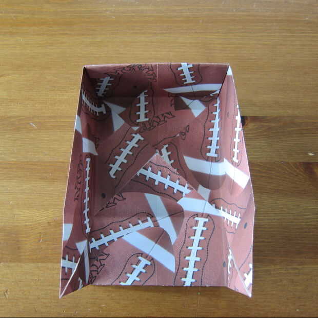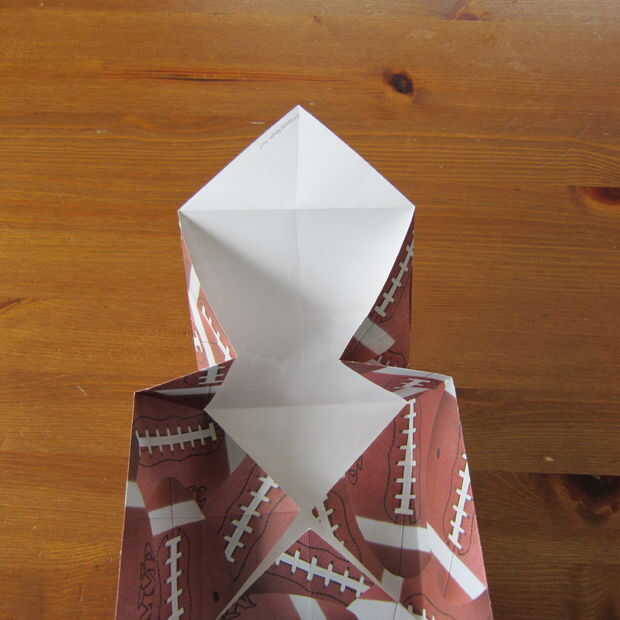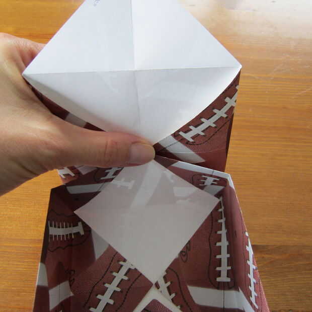 Desplegar una esquina y pellizcar en los lados para hacer el lado de la caja. Repita en el otro lado.