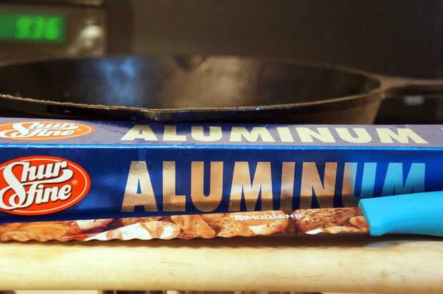 Papel de aluminio, cuchillos, cuchara, agarraderas, colador y tabla de cortar