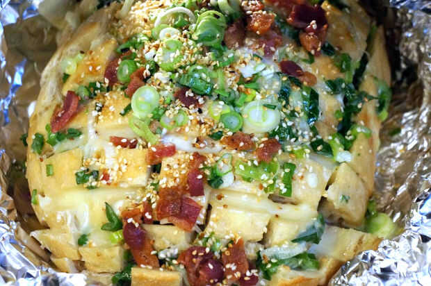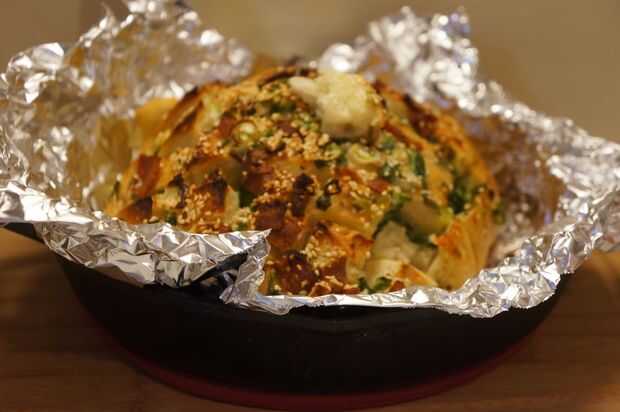 Colocar un pedazo grande de papel de aluminio dentro de la sartén, asegurándose de que hay suficiente para cubrir el pan; o usted puede lavar la sartén después de remover la mezcla de cebolla y añadimos la hoja.