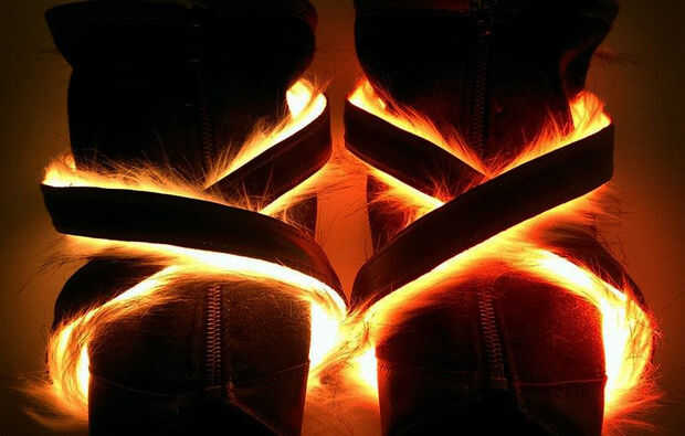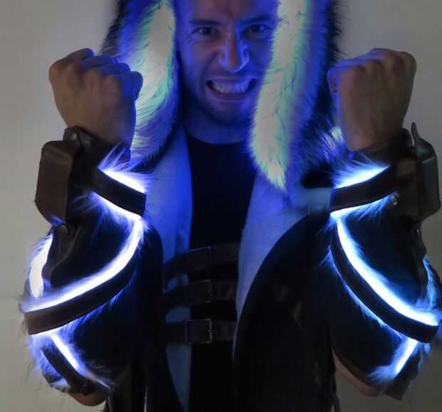 Estaba muy contento con la forma como resultó este efecto de iluminación. El LED brilla a través de la piel parece serpientes ardientes o bandas de luz mágica que arrolla alrededor de sus muñecas. El diseño de la pieza es cómodo y resistente y se ve casi como bueno durante el día como en la oscuridad. Creo que brazaletes como estos sería una gran adición a una gran cantidad de conjuntos de traje... y probablemente le dará superpoderes también.