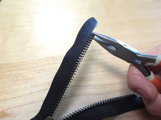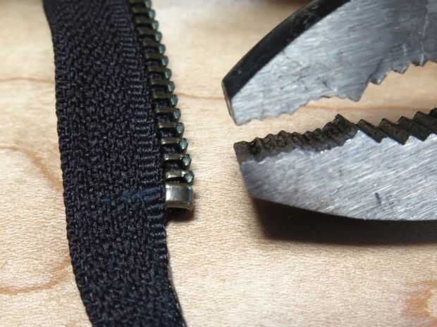 Cuidadosamente corte los dientes de ambos lados de la cremallera por encima de su marca, corte cerca de los dientes como sea posible. Luego use sus plyers para quitar uno de los dientes de cada lado.