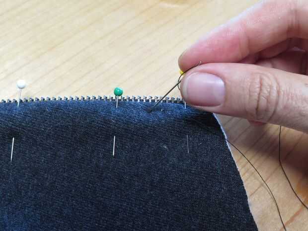 Para hacer la costura final de la cremallera tan fácil como sea posible, basado la cremallera al tejido con una aguja de coser de mano. Esto sólo toma unos minutos porque puede tomar grandes puntadas y definitivamente merece la pena su tiempo.