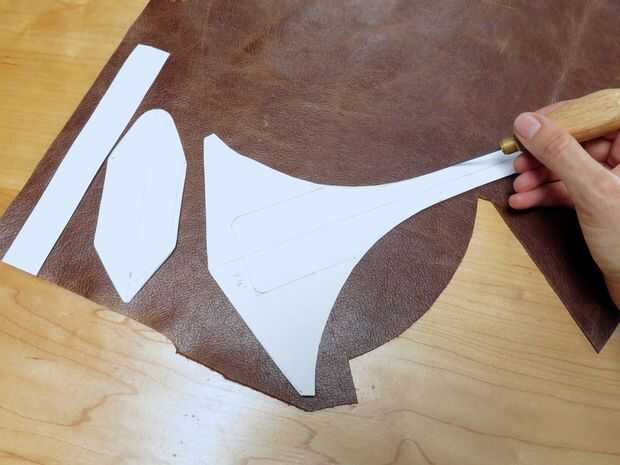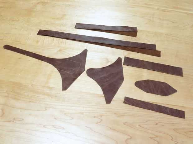 Rastrear los patrones de cuero sobre mi piel usando un punzón y recortar con tijeras. También corte unas tiras de cuero para el ribete, el revestimiento para pasar por debajo de la cremallera y las correas que las luces. Hice las tiras de borde y las piezas de correa ancho de 1.25" y la pieza de la cremallera debajo de 1.5" de ancho. La longitud de las correas y los bordes depende del tamaño de los brazaletes (mina eran unos 19"), y la longitud de la pieza situada debajo de la cremallera debe ser cerca de 7.5", un poco menos de la cremallera.