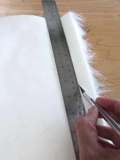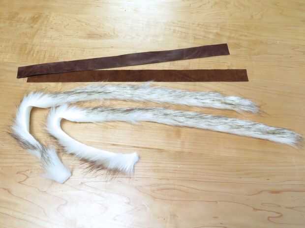 Cortar 2 tiras de piel de la misma longitud que mi correa de piel, pero sólo 1" de ancho. Orienté las tiras para pone la dirección de los pelos a lo largo de la longitud de la tira. Usé mi cuchillo xacto para cortar la piel de la parte trasera. Esta es la mejor manera para cortar piel sintética ya que evita cortar los pelos, que puede que se vea disparejo y desnivelado.