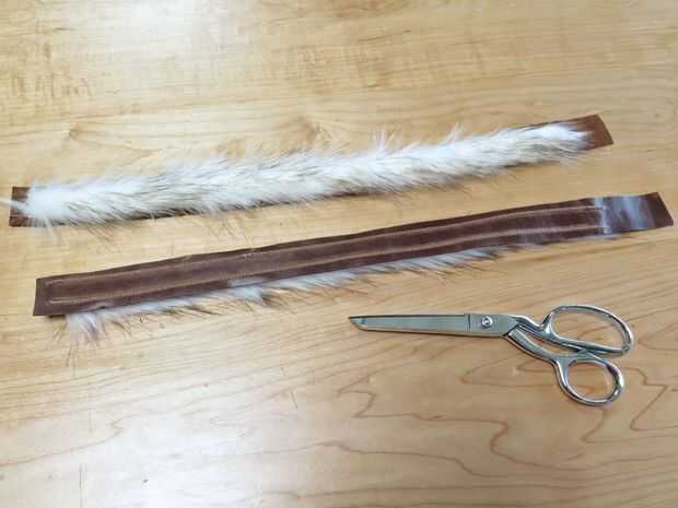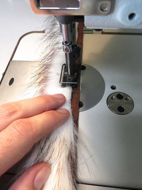 Entonces tomé las correas a mi máquina de coser y coser la piel hasta cuero en un extremo, que mi línea de puntada muy cerca del borde de la piel. Me aseguré que estaba cosiendo en la dirección que son mentira los pelos de la piel (como acariciar a un gato la manera correcta) y los pelos al lado como cosí. He utilizado en máquina de pie a pie industrial que puede coser fácilmente a través de gruesas capas, pero una máquina casera con una aguja de coser cuero funcionará también.