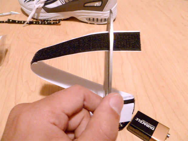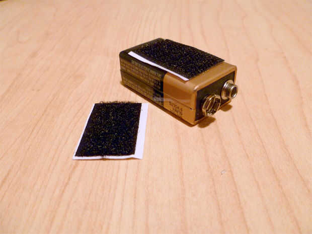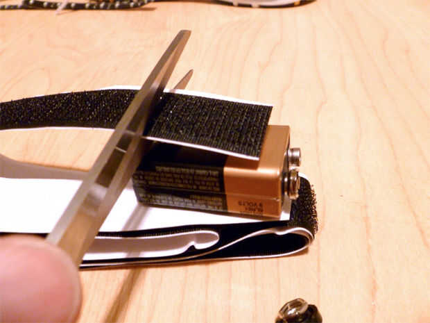 Tome la cinta de Velcro y medir un buen tamaño para ser colocado en la pila de 9 voltios.