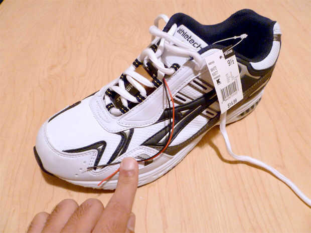 Aquí es la idea básica. La batería será velcro encima de la lengüeta del zapato y el cable de 9 voltios se ejecutará dentro del zapato. Aquí se muestra desde el exterior para ilustrar la idea. El L.E.D se colocará también en el exterior como la imagen de abajo. Colocaré un agujero donde se encuentra mi dedo.