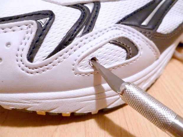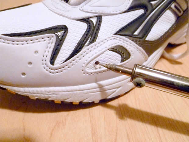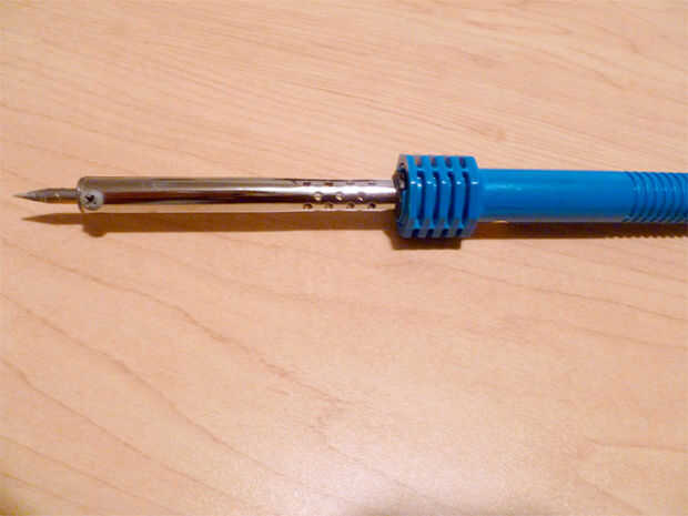 Con el poke de cuchillo de Excel un pequeño orificio, el cuchillo debe ir pensado el material. Ahora toma la pistola de soldar y golpee ligeramente el agujero que acaba de hacer con el cuchillo, la pistola de soldar a limpiar los bordes del agujero.