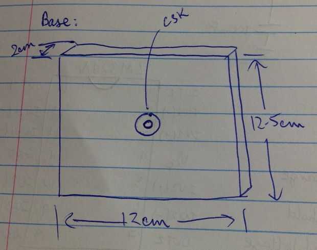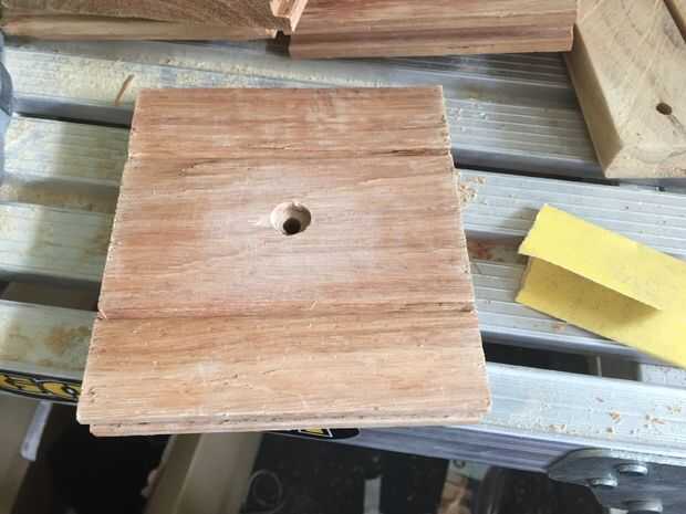 Tomar su pedazo de placa base madera y cortarlo a un tamaño adecuado. Corté mi a 120x125x20mm que era suficiente para mantener la lámpara base estable. Una vez más, dar todas las superficies de un buen lijado más para eliminar las astillas y hacer todas las superficies son lisas. A continuación, en la parte inferior de la placa base, marcar y perforar un agujero en el centro de la placa base. Hacer avellanados ancho suficiente para que usted puede apretar y aflojar el perno con una llave como sea necesario. El sujetador que utilicé era un perno de cabeza hexagonal para madera, esto requiere un agujero avellanado en la placa base para asegurarse de que la cabeza del tornillo no sobresalga de la placa base.