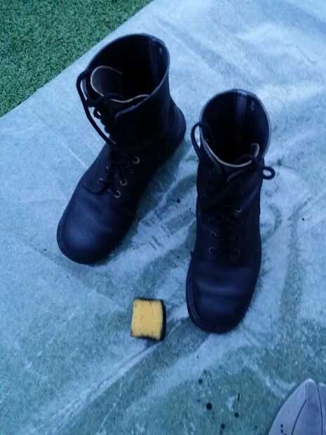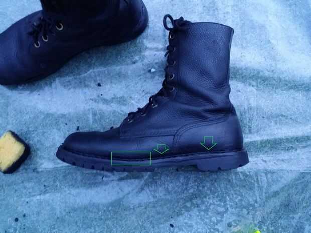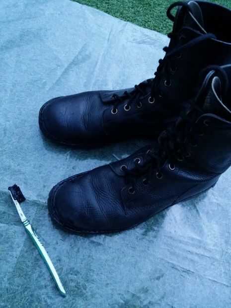 Con el cepillo de dientes viejo, extender una capa generosa de esmalte alrededor de los lados del zapato (en las cuerdas donde es cosida la suela en el zapato-cheque la foto).