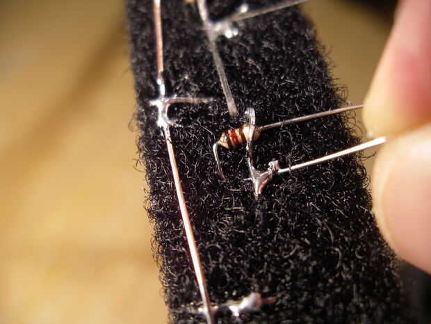 Resulta útil para insertar unas pocas resistencias, y soldarlos en el lugar.  Incluso si usted dobla todo perfectamente, es difícil trabajar con las resistencias empujando hacia el lado.