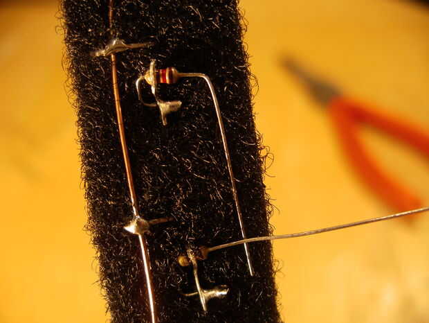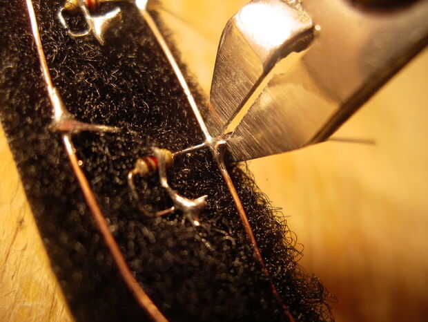 Grab su 24 cable desnudo calibre y soldar todas las resistencias entre sí. Recuerde dejar unas pulgadas de alambre extra en el final. Este cable va a conectar a un pin PWM de Arduino BRD.