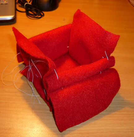 4) coser los lados marcados con flechas rojas y azules juntos. Uno no está marcada porque me quedo sin espacio, pero cuando haya terminado debe ser una forma de caja. Tenga cuidado en las esquinas, hay tres capas de material de conexión, por lo que podría ser un poco más difícil obtener a través de