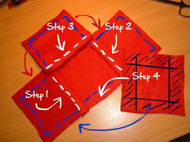 2) doble las plazas hacia fuera y luego conectar la cuarta plaza en los dos que se doblan hacia fuera (paso 3). Asegúrese de que su tela es hacia el camino correcto