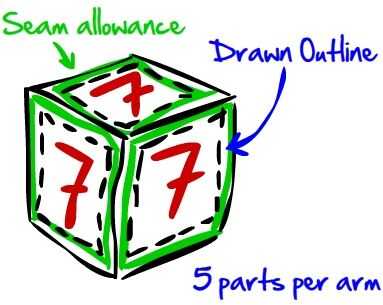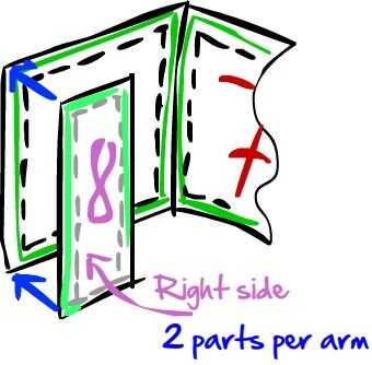 Empezaremos con el brazo, para deshacerse de las pequeñas y numerosas piezas necesarias para ellos. Necesitarás cinco #7 piezas por brazo. Se va a ver como una caja abierta hacia arriba. No la cosa hasta el final, dejando el margen de costura gratis unir a las otras partes más adelante.