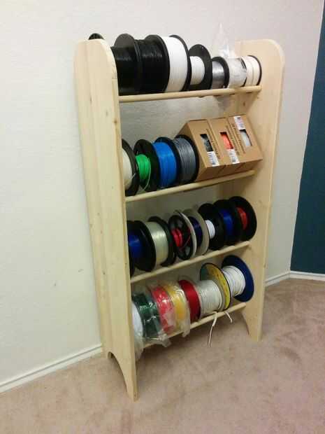 Esta simple construcción de rack de bobina puede utilizarse para almacenar muchos rollos de impresión 3D del filamento, u otros carretes semejantemente formados (hay algunos cables de cobre también en el pic). Se podría incluso utilizar como un estante funky si quieres!
