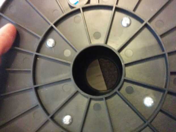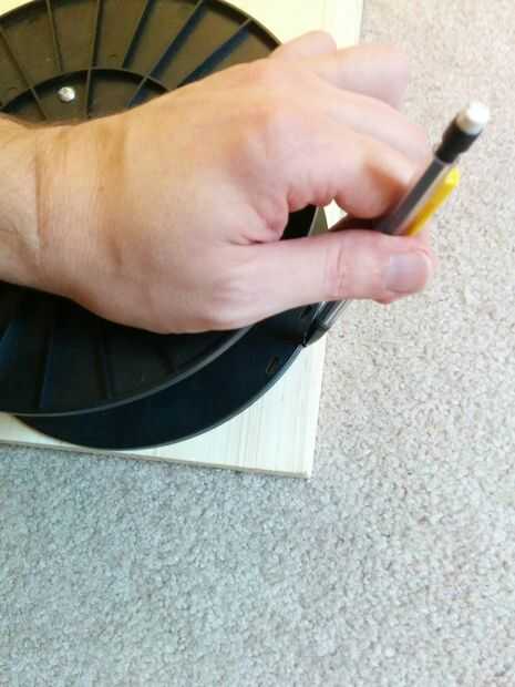 Para la parte inferior, medir el centro del tablero y una marca, luego alinee el centro del carrete con el borde del tablero y esta marca. Sujete el carrete y traza el semicírculo.