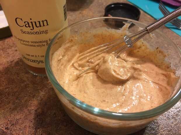 Esta noche estamos utilizando un mayo cajun probado y verdadero. Tomar sobre media taza de mayo con una cucharada de tu sazonador cajun favorito y mezclar vigorosamente. Esta combinación lleva al menos 30 minutos para hidratar bien. Más adelante se prepara el mejor sabrá.
