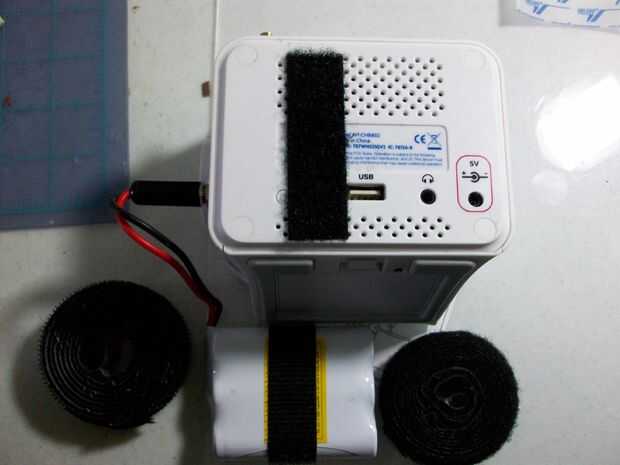 Por razones puramente estéticas, volví a colocar las cubiertas de los tornillos ya que es un regalo. Luego tomar el Velcro y añadir una tira a la batería y Super Chumby. Vertical es mejor ya que permite colocar al ras de la superficie en que el Chumby Super está la parte inferior de la batería. Otra cosa el peso puede hacer que se inclinen hacia atrás. Finalmente Conecte la antena y conecte la batería. Ya está terminado su Chumby Super! Enchufe cargarlo y disfrutar alrededor de 6 horas de música ininterrumpida!