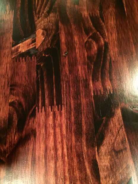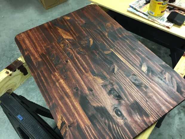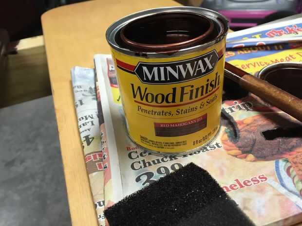 Tuve una mancha rojo caoba he utilizado en otros proyectos y pensé que sería una buena opción. Me gusta cómo resultó demasiado... daba la madera casi un aspecto de cereza brasileña.