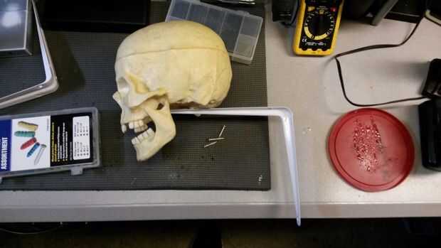 Pude obtener dos puntos de contacto en el cráneo. He usado resina de 5 toneladas de 5 minutos. Puede utilizar una abrazadera para mantener unida a la Asamblea o se puede utilizar 2-12" lazos Zip envuelve el cráneo para unir durante las curas de epoxy. No tenga miedo de ser algo liberal con el epoxi.