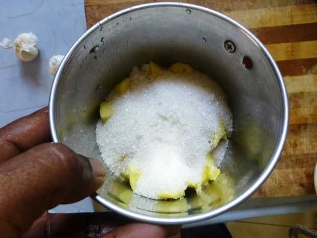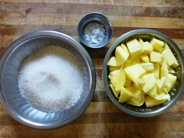 - Tomar azúcar alrededor de la mitad la cantidad de cubos de mango.
