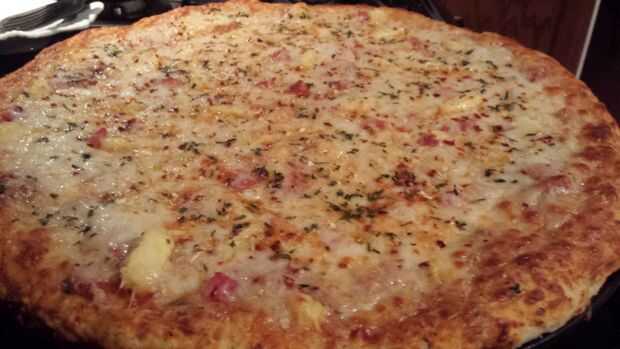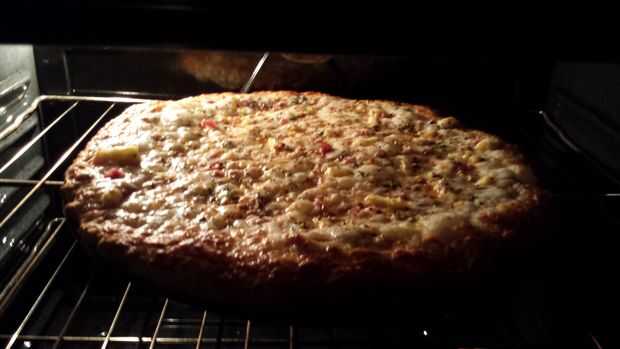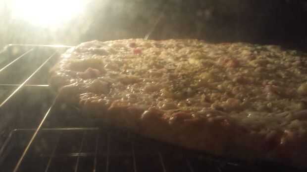 Lanzar la pizza en el horno por 14 minutos o hasta dorado y burbujeante con la corteza crujiente.